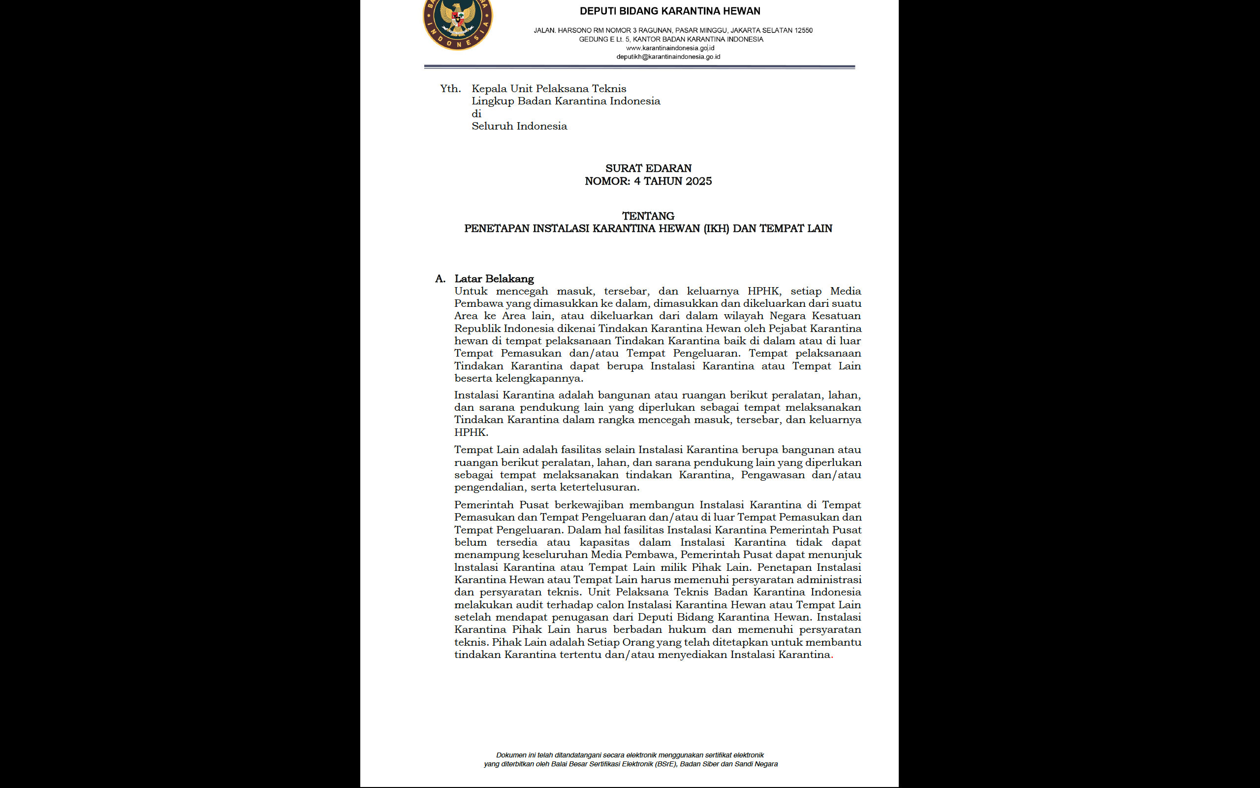 Surat Edaran Nomor 4 Tahun 2025 Tentang Penetapan Instalasi Karantina Hewan (IKH) Dan Tempat Lain