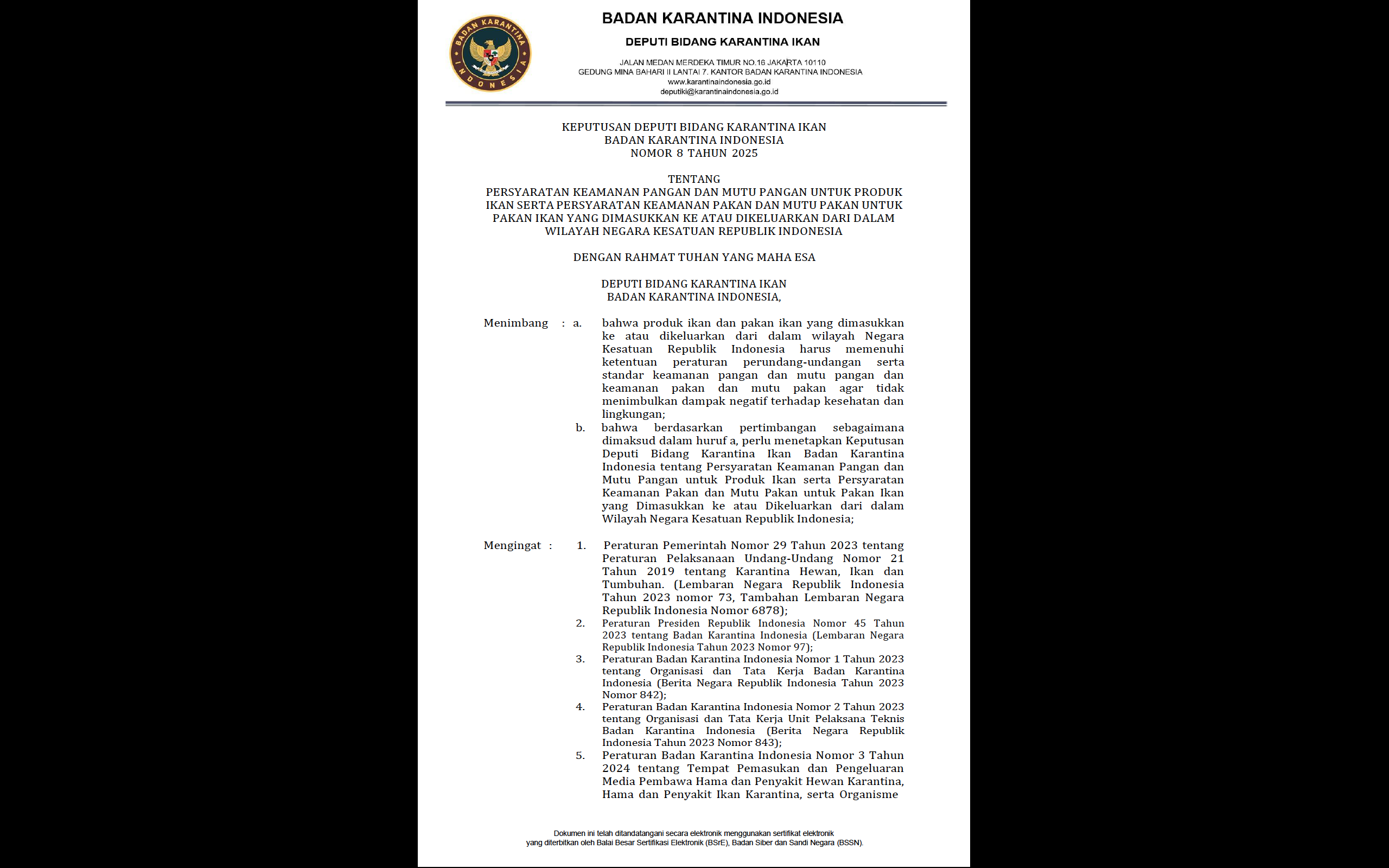 Keputusan Deputi Bidang Karantina Ikan Badan Karantina Indonesia Nomor 8 Tahun 2025 Tentang Persyaratan Keamanan Pangan Dan Mutu Pangan Untuk Produk Ikan Serta Persyaratan Keamanan Pakan Dan Mutu Pakan Untuk Pakan Ikan Yang Dimasukkan Ke Atau Dikeluarkan Dari Dalam Wilayah Negara Kesatuan Republik Indonesia