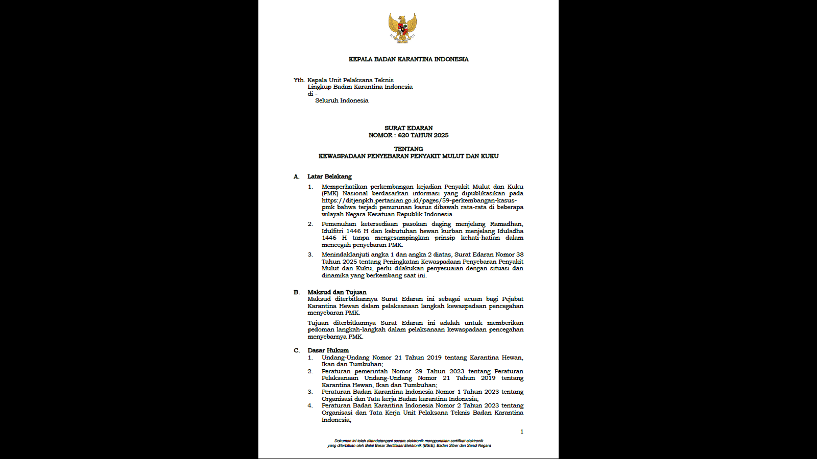 Surat Edaran Kepala Badan Karantina Indonesia Nomor : 620 Tahun 2025 Tentang Kewaspadaan Penyebaran Penyakit Mulut Dan Kuku