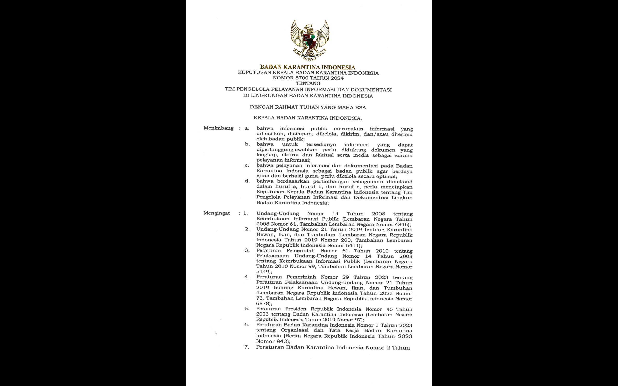 Keputusan Kepala Badan Karantina Indonesia Nomor 8700 Tahun 2024 tentang Tim Pengelola Pelayanan Informasi Dan Dokumentasi Di Lingkungan Badan Karantina Indonesia