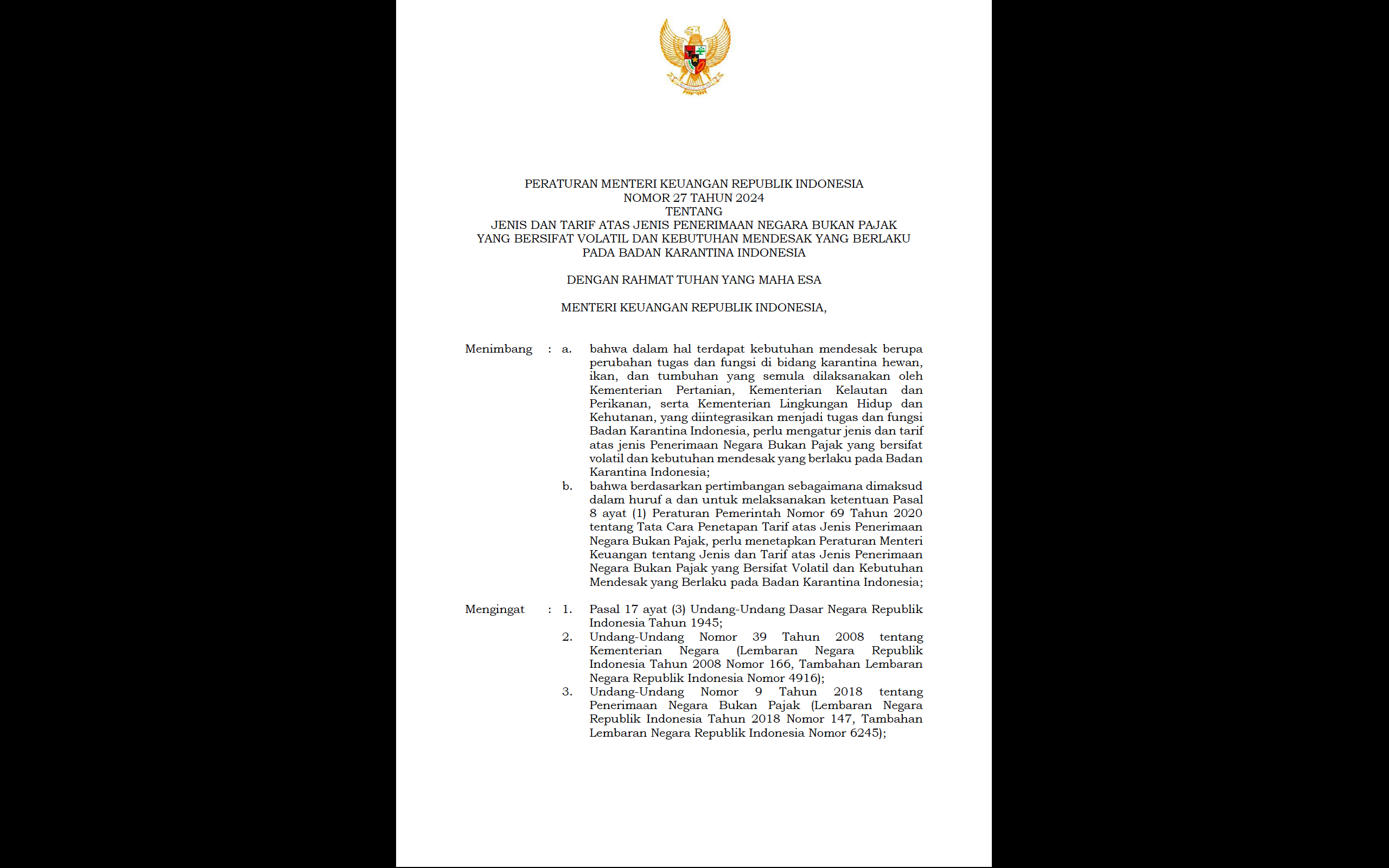 Peraturan Menteri Keuangan Nomor 27 Tahun 2024 tentang Jenis Dan Tarif Atas Jenis Penerimaan Negara Bukan Pajak Yang Bersifat Volatil Dan Kebutuhan Mendesak Yang Berlaku Pada Badan Karantina Indonesia