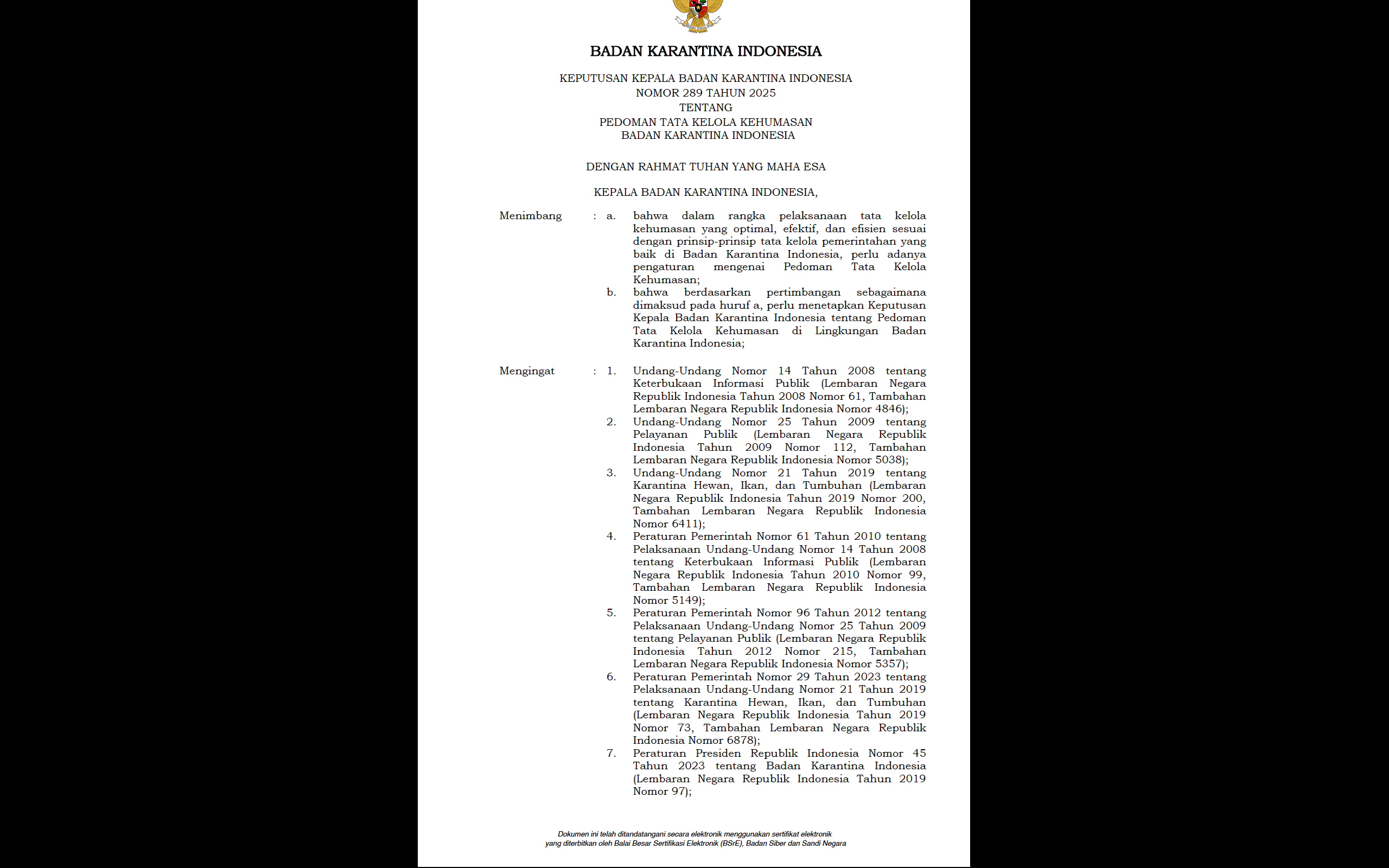 Keputusan Kepala Badan Karantina Indonesia Nomor 289 Tahun 2025 Tentang Pedoman Tata Kelola Kehumasan Badan Karantina Indonesia