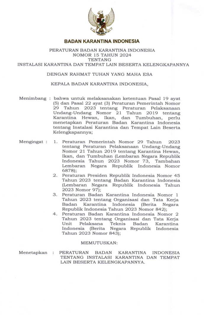 Peraturan Badan Karantina Indonesia Nomor 15 Tahun 2024 Tentang Instalasi Karantina Dan Tempat Lain Beserta Kelengkapannya