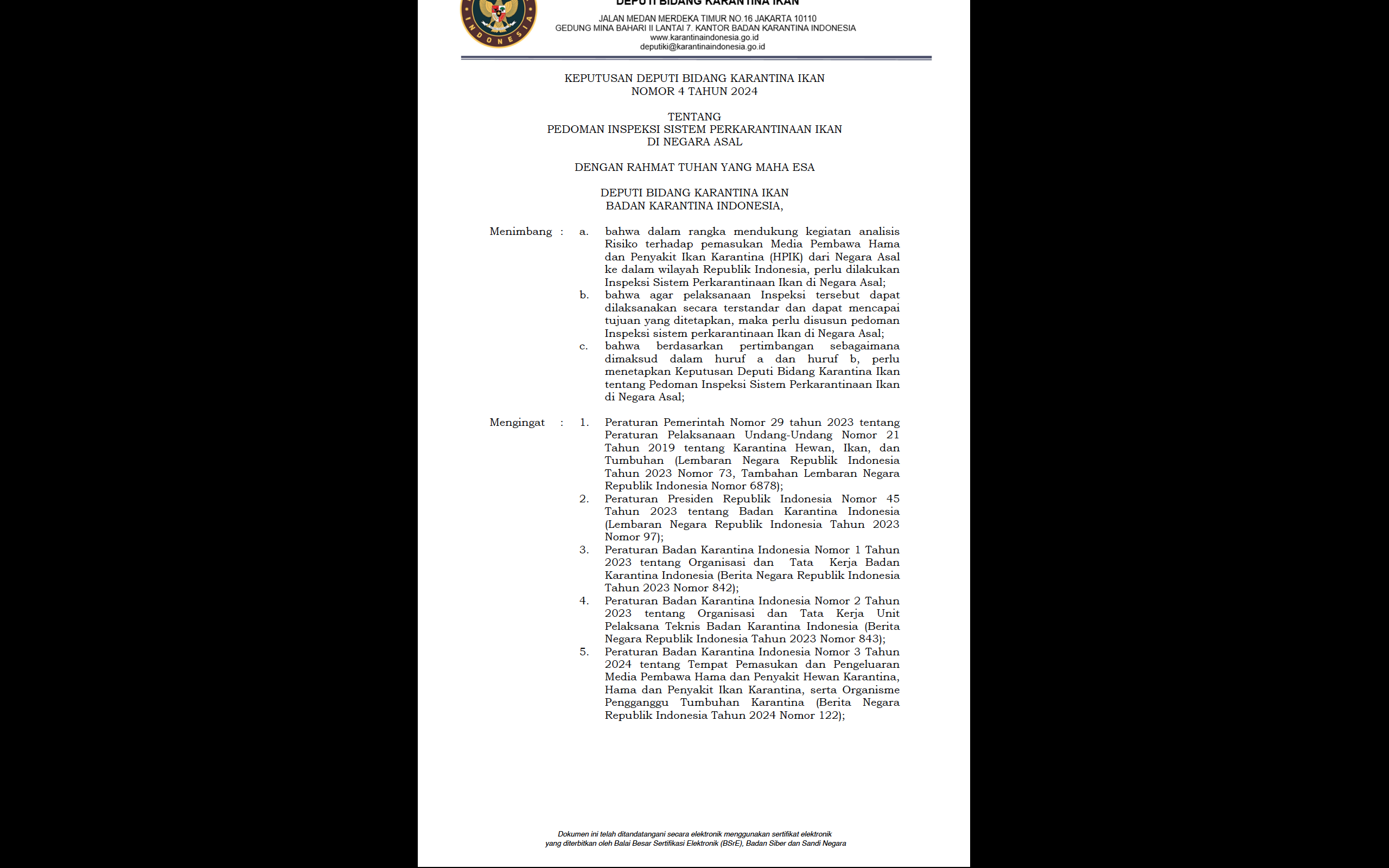 Keputusan Deputi Bidang Karantina Ikan Nomor 4 Tahun 2024 Tentang Pedoman Inspeksi Sistem Perkarantinaan Ikan Di Negara Asal